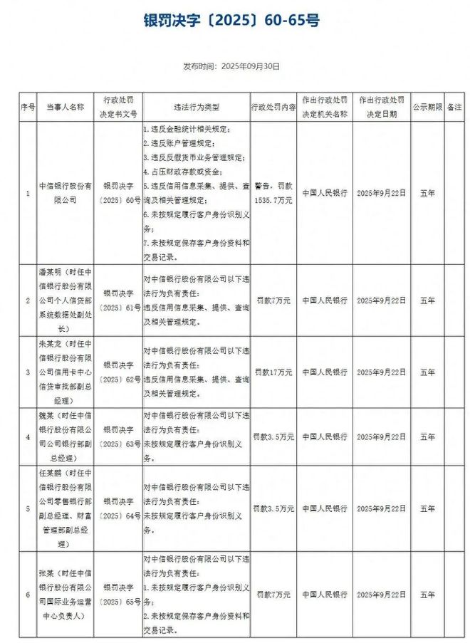 2025年,可以说是中信银行的“罚单高峰年”。