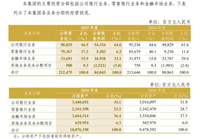 金融市场业务,资产占比由37.5%下降至36.4%,营收占比由15.0%提升至15.7%,分部税前利润占比从29.4%显著提升至32.1%,是第二大利润来源。