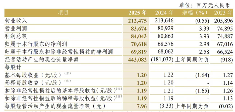 从合并报表口径来看,该行总资产达到10.13万亿元,同比增长6.28%;营业收入为2124.75亿元,同比微降0.55%;归母净利润为706.18亿元,同比增长2.98%。整体仍维持“增利不增收”的状态,规模和利润都没有明显失速。