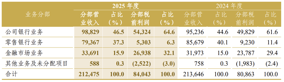 2025年,公司银行业务的资产占比由31.8%提升至34.1%,营收占比由44.6%升至46.5%,税前利润占比进一步提高至64.6%,成为全行最主要的利润来源。与此同时,金融市场业务虽然资产占比小幅下降至36.4%,但营收和利润贡献持续提升,税前利润占比达到32.1%,稳居第二大盈利板块。