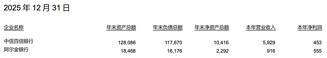 中信百信银行2024~2025年财务数据,来源:中信银行2025年审计报告