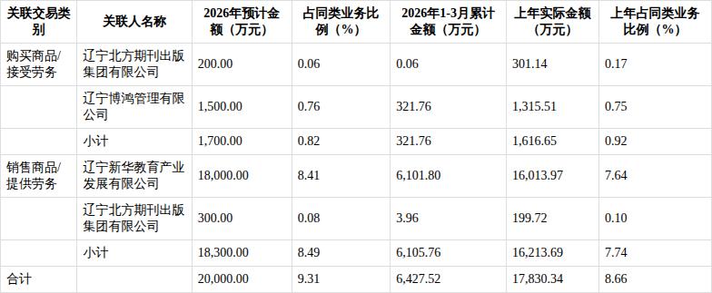 销售商品/提供劳务方面,2026年预计总金额为18300万元,较2025年实际发生的16213.69万元增长约12.87%。主要增长点来自辽宁新华教育产业发展有限公司,预计销售额为18000万元,占同类业务的8.41%,2025年实际销售额为16013.97万元,占比7.64%,预计金额增长1986.03万元,增幅约12.40%,占比也有所提升。向辽宁北方期刊出版集团有限公司预计销售300万元,占同类业务的0.08%,2025年实际销售199.72万元,占比0.10%,预计金额增长,但占比略有下降。2026年1-3月,销售商品/提供劳务累计已发生6105.76万元,占全年预计的33.36%。