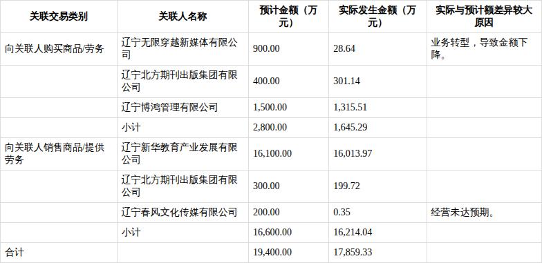 从购买端来看,2025年公司预计向关联方购买商品/劳务金额为2800万元,实际发生1645.29万元,完成度约为58.76%。其中,向辽宁无限穿越新媒体有限公司的购买额大幅低于预期,预计900万元,实际仅发生28.64万元,主要原因是业务转型导致金额下降。向辽宁北方期刊出版集团有限公司购买额为301.14万元,完成预计400万元的75.29%。向辽宁博鸿管理有限公司购买额为1315.51万元,完成预计1500万元的87.70%。