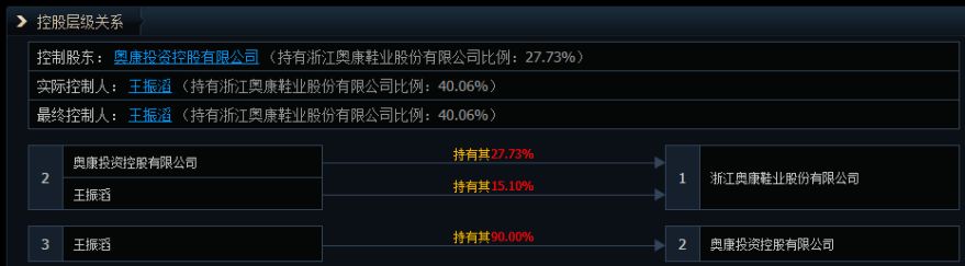 数据显示,奥康国际的控股股东为奥康投资控股有限公司(以下简称奥康投资),持股比例为27.73%。王振滔担任奥康国际董事长兼总裁,直接持股15.10%,同时持有奥康投资90%的股权。王振滔直接与间接持股合计达40.06%,为奥康国际的实际控制人。