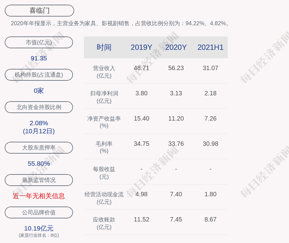 2020年年报显示,喜临门的主营业务为家具、影视剧销售,占营收比例分别为:94.22%、4.82%。