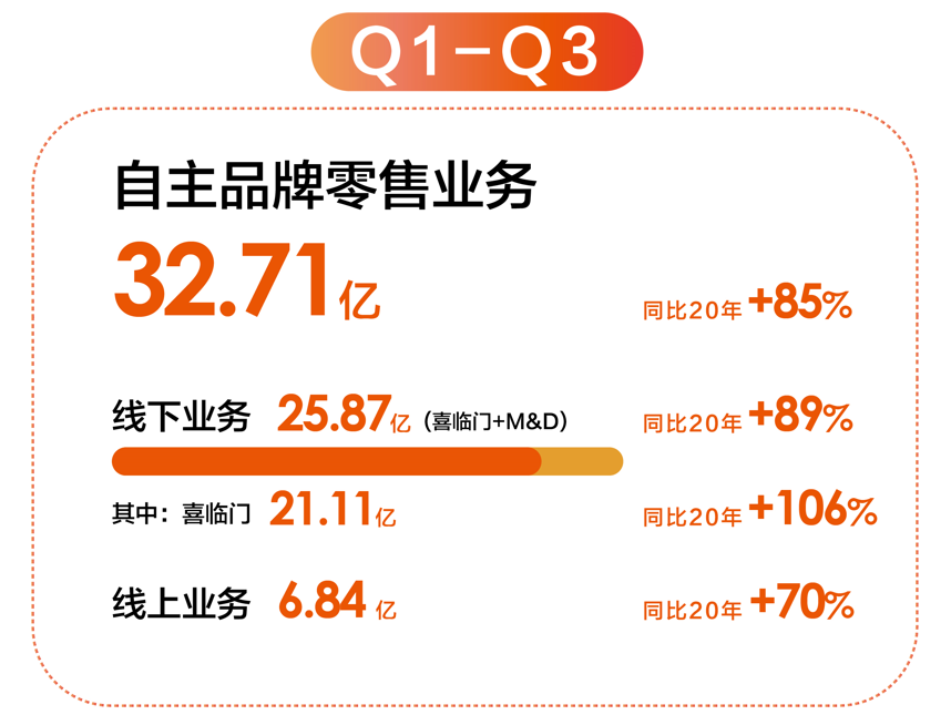 而此次三季报的披露,给予这种定位以积极回应。数据显示,2021年前三个季度,喜临门自主品牌零售业务营收32.71亿元,同比增幅85%。其中,线下业务营收25.87亿元,同比增幅89%;线上业务营收6.84亿元,同比增幅70%。而在一般被看作建材家居淡季的第三季度,喜临门自主品牌业务实现营收12.79亿元,同比2020年高增58%,其中仅线下业务实现营收10.17亿元,增幅61%,线上业务即实现营收2.62亿元,增幅47%。高增长的态势表明,在全新市场战略引导下,喜临门自主品牌再一次成为营收增利新引擎。