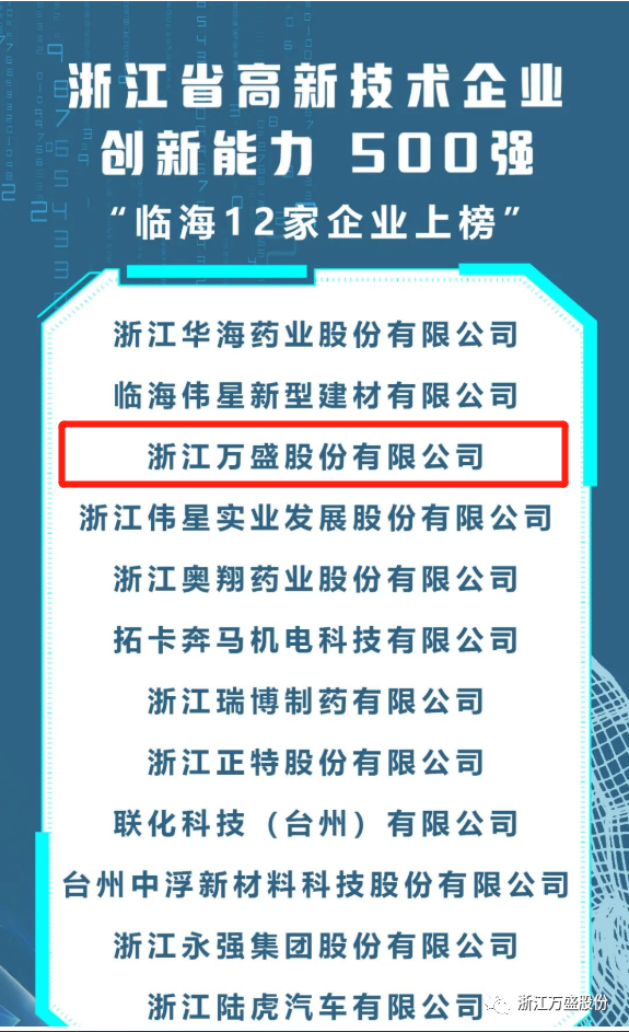 近日,2022年浙江省高新技术企业创新能力500强新鲜出炉,万盛股份荣登榜单。