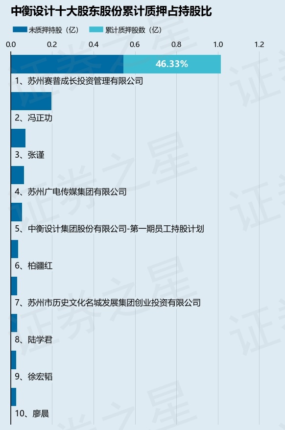 截止本公告日,股东苏州赛普成长投资管理有限公司已累计质押股份4700.0万股,占其持股总数的46.33%。本次质押后中衡设计十大股东的累计质押股份占持股比例见下图:
