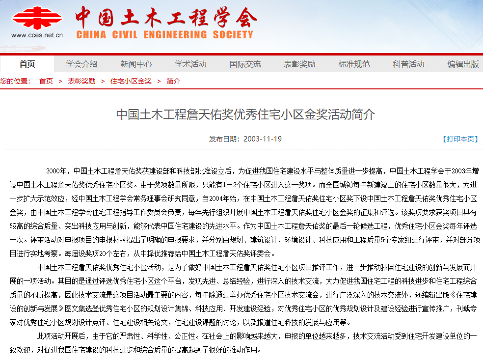 中国土木工程学会于2003年增设中国土木工程詹天佑奖优秀住宅小区奖。由于奖项数量所限,只能有1—2个住宅小区进入这一奖项。而全国城镇每年新建竣工的住宅小区数量很大,为进一步扩大示范效应,经中国土木工程学会常务理事会研究同意,自2004年始,在中国土木工程詹天佑奖住宅小区奖下设中国土木工程詹天佑奖优秀住宅小区金奖每届设奖项20个左右,从中择优推荐给中国土木工程詹天佑奖评委会。