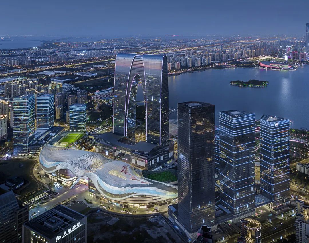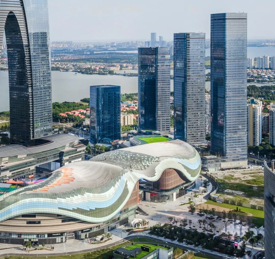 苏州中心项目,位于苏州工业园区湖西CBD区域,总投资约180亿元,项目包括7栋高层塔楼(最高218.8米),1座大型商业建筑,集涵盖商业、办公楼、公寓和酒店等多种业态。是一座人与自然、建筑与城市交相辉映、多元共融的超大型城市共生体,集绿色、生态、低碳、智慧于一体,作为江苏省重点民生工程,引领了长三角区域TOD模式下城市一体化开发的新浪潮。