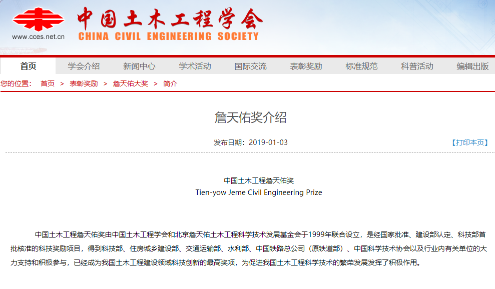 中国土木工程詹天佑奖由中国土木工程学会和北京詹天佑土木工程科学技术发展基金会于1999年联合设立,是经国家批准、建设部认定、科技部首批核准的科技奖励项目,已经成为我国土木工程建设领域科技创新的最高奖项,为促进我国土木工程科学技术的繁荣发展发挥了积极作用。