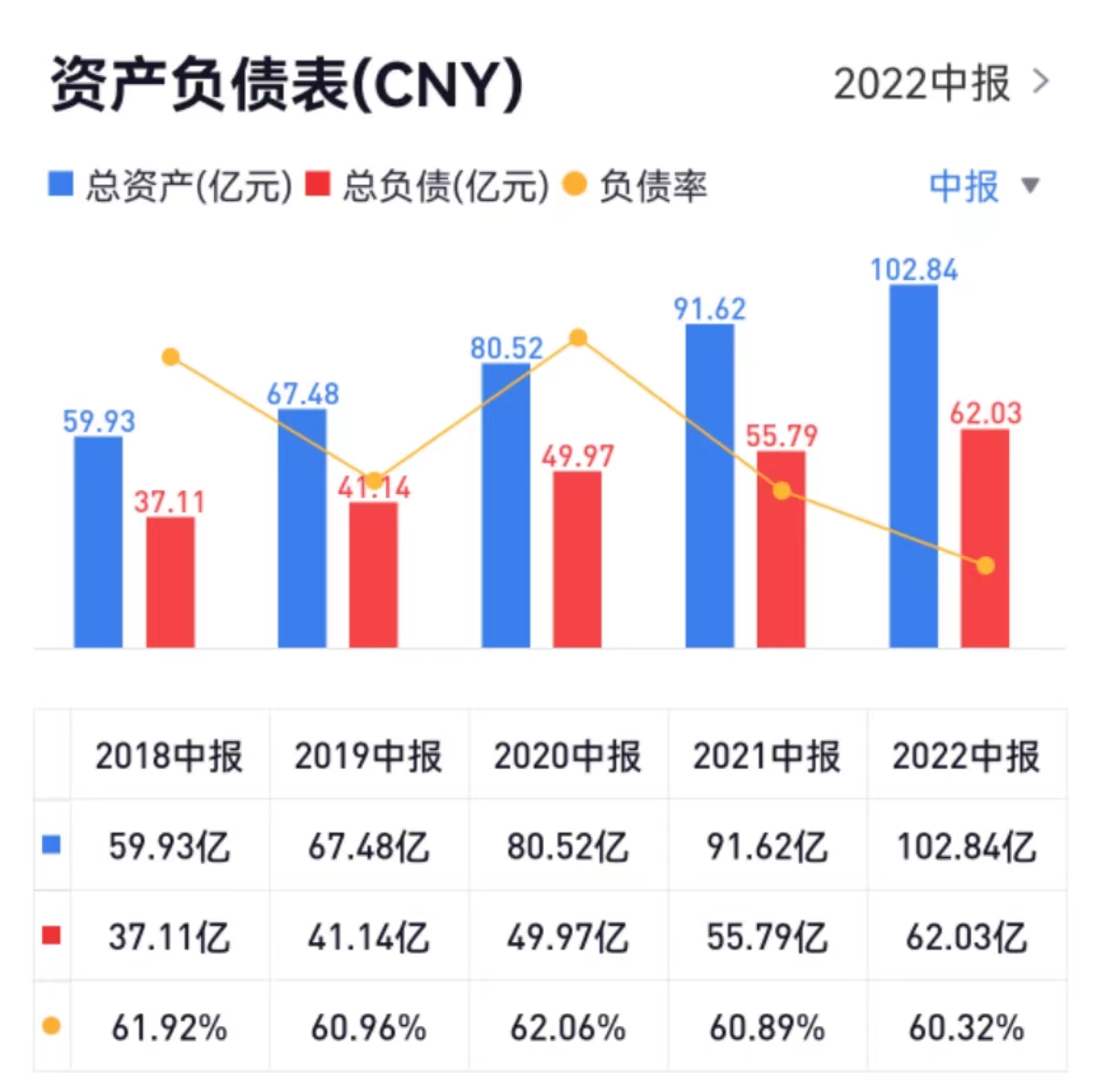 2018年至2022年中报,华设集团总负债分别为37.11亿元、41.14亿元、49.97亿元、55.79亿元、62.03亿元;负债率分别为61.92%、60.96%、62.06%、60.89%、60.32%。
