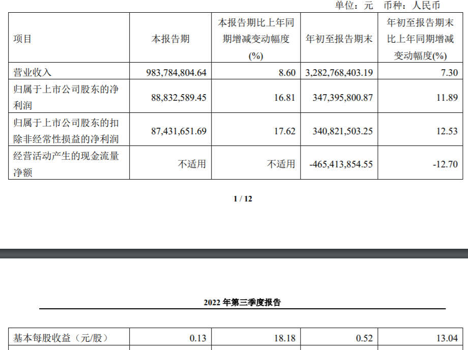 据公告,2022年第三季度,华设集团营业收入9.84亿元,同比增8.6%;归属于上市公司股东的净利润8883.26元,同比增16.81%。前三季度,华设集团营业收入32.83亿元,同比增7.3%;归属于上市公司股东的净利润3.47亿元,同比增11.89%。