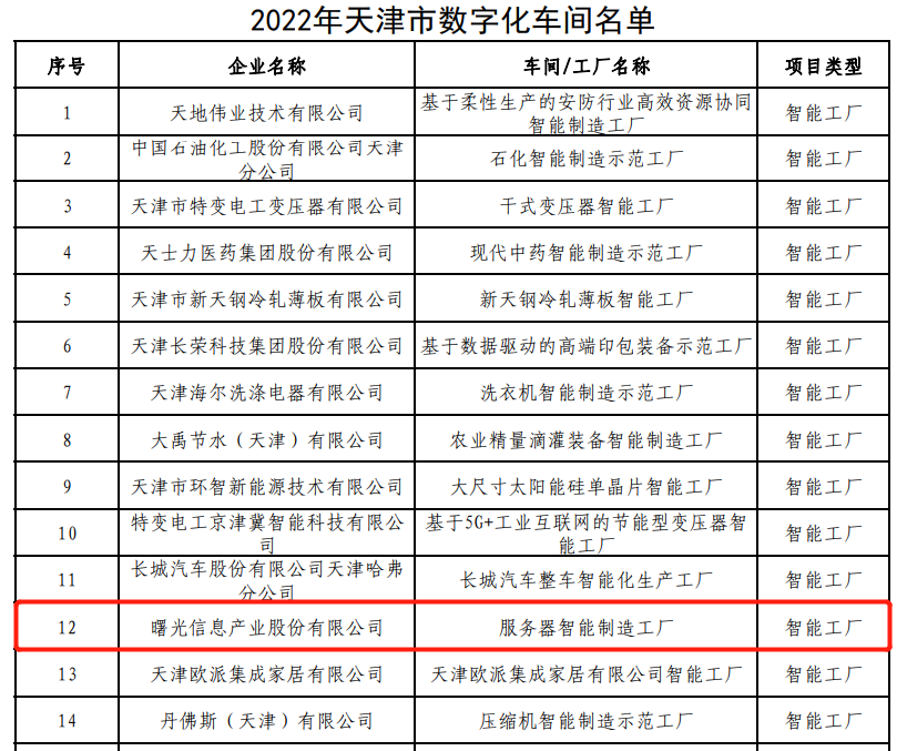 近日,天津市工业和信息化局遴选公布100家智数化程度高、科技水平领先、引领带动作用强的数字化车间和智能工厂(智能工厂17家,数字化车间83家),中科曙光位列其中,荣获“数字化车间和智能工厂”称号。