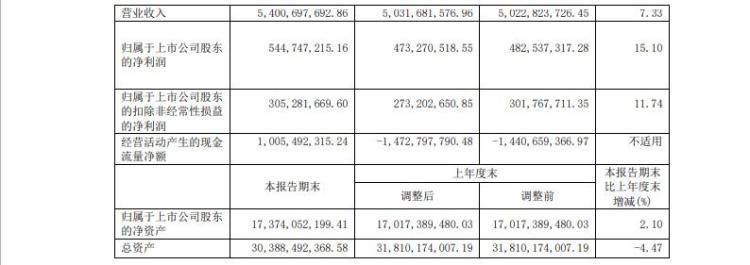 报告期内,公司持续专注主营业务的生产经营并致力于为客户提供优质服务,通过加大研发投入,提升产品品质,深化营销服务,不断提高公司整体竞争力,促进业绩持续增长。报告期公司实现营业总收入54亿元,增长比率为7.33%;实现归属于上市公司股东净利润5.44亿元,增长比率为15.10%。
