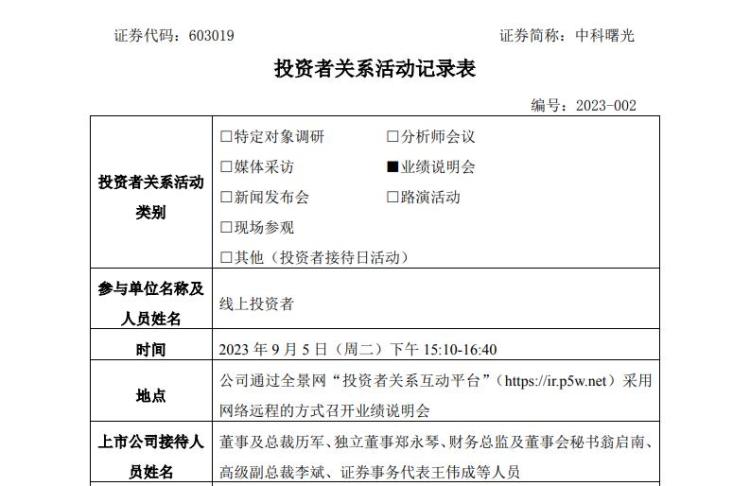 就投资者关于曙光未来发展规划愿景的提问,中科曙光回应称,公司作为我国核心信息基础设施领军企业,致力于为中国及全球用户提供创新、高效、可靠的IT产品、解决方案及服务。多年来曙光不断研磨关键技术,夯实拳头产品,并与产业上下游伙伴协同创新,为行业应用创新和信息化提质增效提供了坚实支撑。数字经济为发展带来活力的同时,公司也要看清行业面临的挑战。未来曙光将做到“内外兼修”。于内,坚定推进自我革新。进一步完善制度、优化流程、提升效率、精益管理。于外,坚定以市场为导向。研发、产品、销售、服务等各个体系,要以满足市场需求为目标,持续提升客户体验和服务价值,不断提高公司竞争力,促进业绩持续增长,更好地回报广大投资者。