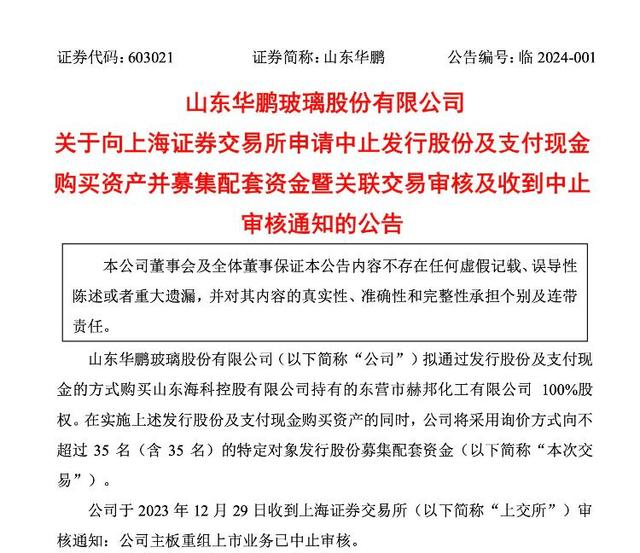 1月1日晚间,山东华鹏(603021)发布公告称,公司于2023年12月29日收到上交所审核通知:公司主板重组上市业务已中止审核。而这已不是山东华鹏重组事项第一次被搁置……