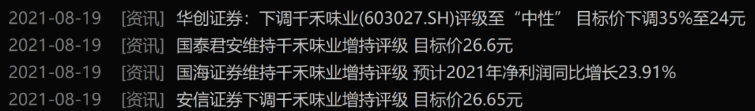 由于利益关系,一般来说,国内券商都不会下调上市公司评级,但最近华创证券和安信证券都下调了千禾味业评级,这其实就是变相的“强烈看空”。