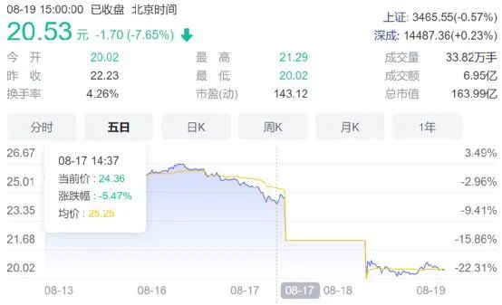 8月19日,千禾味业依然没有喘气的机会。股价继续狂跌不止,截至今天收盘,当日跌去了7.65%,3日的累计跌幅已经超过20%。