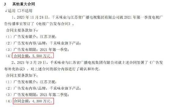 资料显示,2021年一季度,千禾味业成为了江苏卫视《新相亲大会》节目的独家冠名商。根据半年报的披露,仅在江苏卫视新相亲大会这一档节目,千禾味业所投广告就接近1个亿。