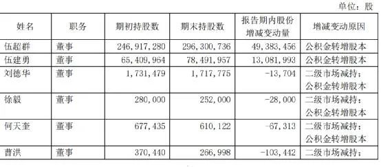 如上图,今年上半年,除了大股东伍超群、伍建勇外,其他董事如刘德华、徐毅、何天奎、曹洪都减持了股份,少则万余股,多则十多万股。变动原因都是二级市场减持,或公积金转增股本。