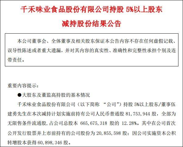 数据显示,从2019年12月31日到2021年3月31日,千禾味业实际控制人、董事长兼总裁伍超群从43.2%减持到37.09%。在2020年上半年,其直接减持813万股,套现2.44亿。随后又减持了1997万股、占总股本3%,再次套现8.08亿元,合计10.52亿元。
