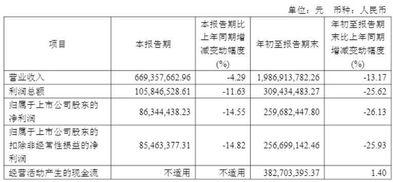 而从第三季度千禾味业的业绩来看,其实现营业收入6.69亿元,同比下降4.29%,实现归母净利润0.86亿元,同比下降14.55%。