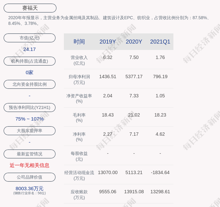 2020年年报显示,赛福天的主营业务为金属丝绳及其制品、建筑设计及EPC、纺织业,占营收比例分别为:87.58%、8.45%、3.78%。