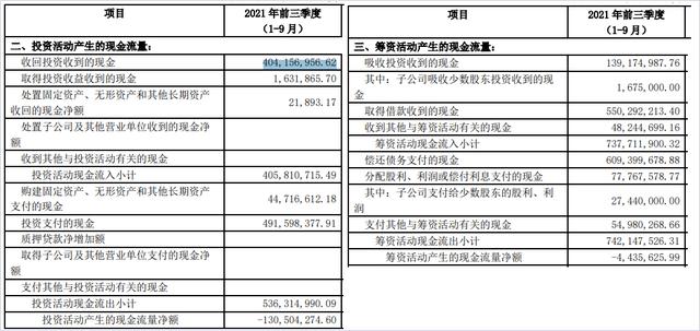 目前已连续3个季度累计“经营现金流净额”为负数,3季报累计经营现金流净额为-2.33亿元。目前公司现金流全靠“收回投资的现金”和“借款收到的现金”支撑。