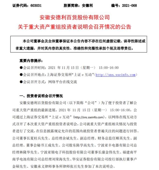 联商快讯:11月15日晚间,安德利发布重大资产重组投资者说明会召开情况的公告。