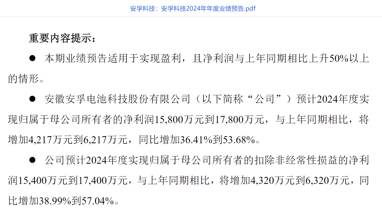 1月14日晚,安孚科技(603031.SH)披露公告称,公司预计2024年实现归母净利润1.58亿元到1.78亿元,同比增长36.41%到53.68%;预计实现扣非归母净利润1.54亿元到1.74亿元,同比增长38.99%到57.04%。
