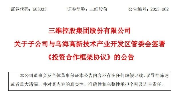 10月20日,三维控股集团股份有限公司(简称"三维股份")发布公告称,子公司内蒙古三维新材料有限公司与乌海高新技术产业开发区管委会签署《投资合作框架协议》,拟在乌海高新技术产业开发区投资建设70万吨/年BDO、50万吨/年可降解塑料PBAT、24万吨/年高端聚醚材料PTMEG、10万吨/年NMP及配套绿电项目,合计总投资148亿元。
