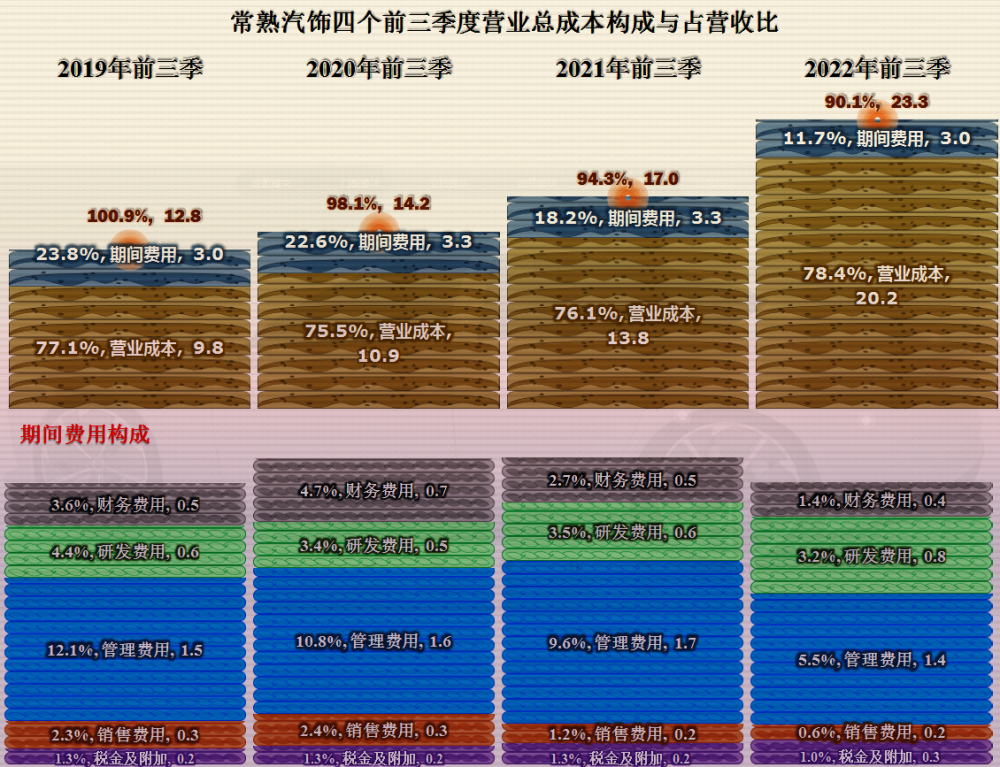 毛利率继续下降,并且已经是最近6个前三季度中最低的表现了,常熟汽饰顶住了这些压力,净利润和净资产收益率均有一定的提升。关键时候拼成本,是不是这种现象呢?我们接着来看他们的成本费用构成和占营收比的情况就知道了。