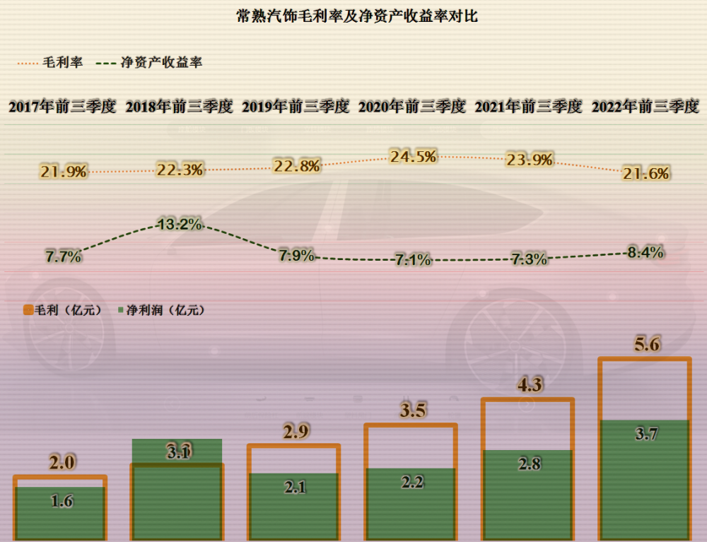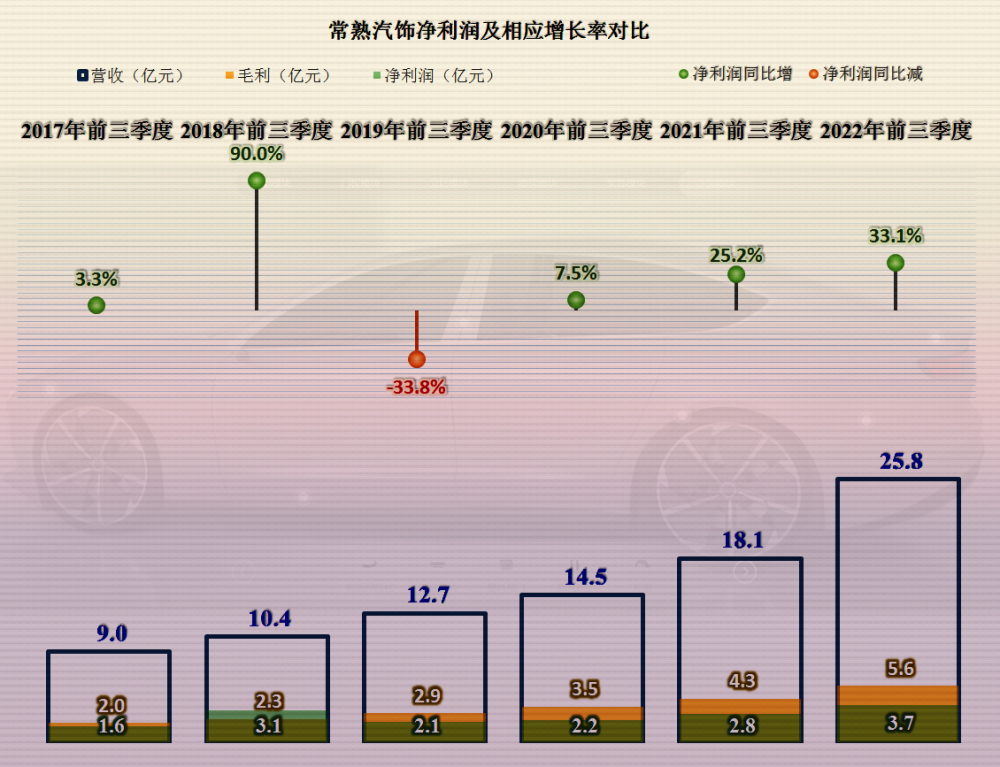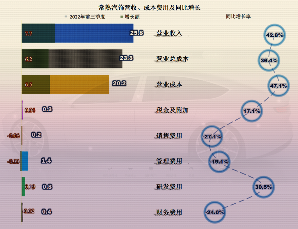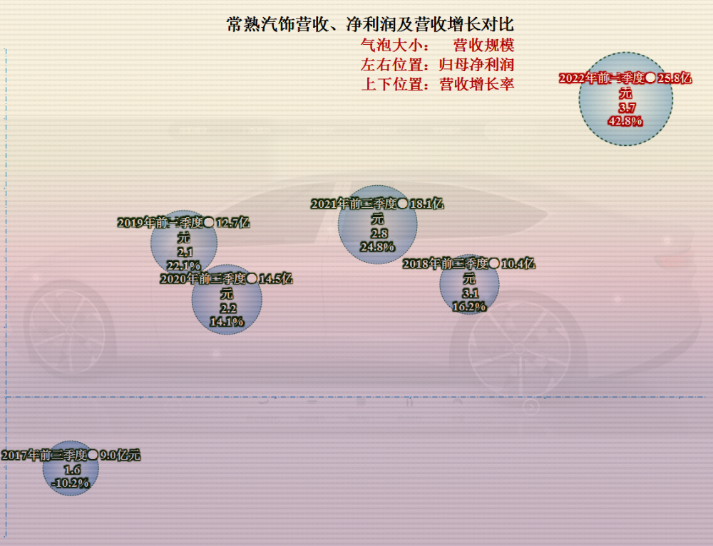 2022年前三季度,常熟汽饰以最大的气泡,位于图中右上角的最佳位置,营收规模、营收增长率和净利润都创下了六年来的新高,这样的表现相当抢眼。特别是营收还能保持42.8%的同比增长,这在同行中要算是优异的表现了。