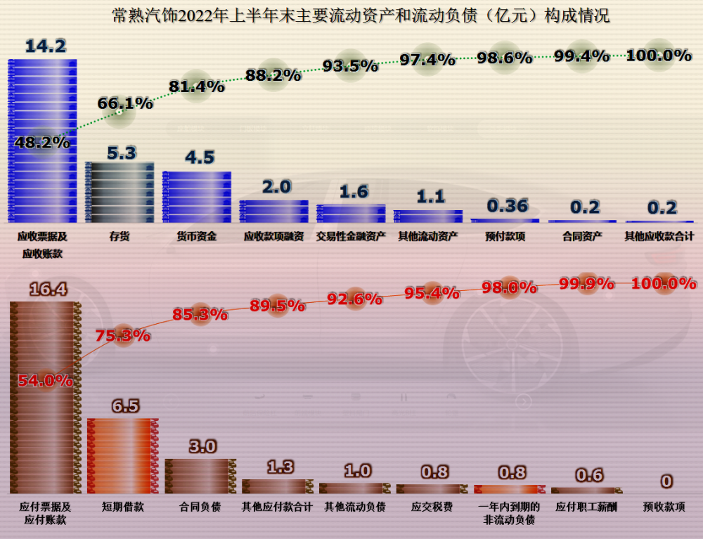 最大的流动资产是应收类业务款项,最大的流动负债是应付类业务款项,汽配行业供应链欠款严重,常熟汽饰还是躲不过的,只是比很多同行要好一些。存货为第二大流动资产,然后才是货币资金,也有一定的交易性金融资产。