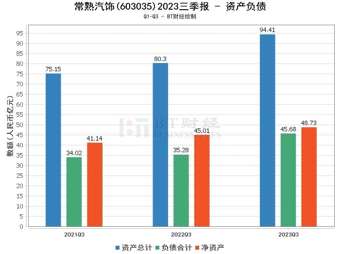 从资产负债方面来看,常熟汽饰2023年三季度末的总资产为94.41亿元,相较于上年度末的85.38亿元,增长了10.58%。负债合计为45.68亿元,相较于上年度末的39.01亿元有所增加。净资产为48.73亿元,相较于上年度末的46.37亿元,增长了5.08%。资产负债率为48.39%,相较于上年度末的45.69%,有所上升。