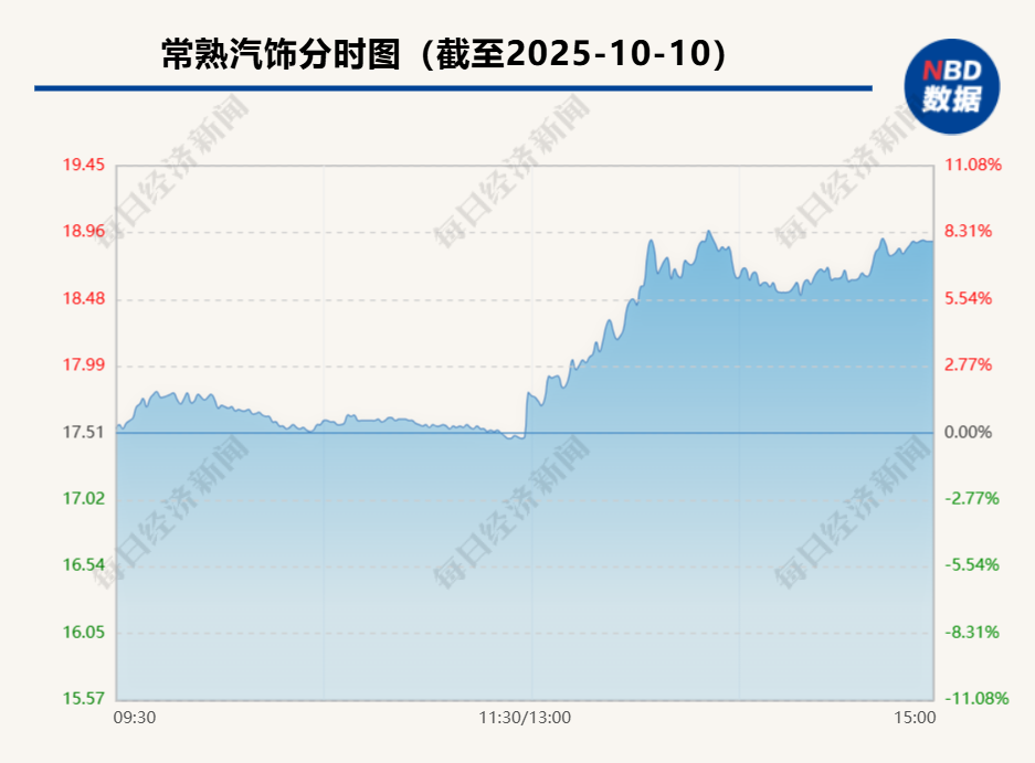 10月10日下午开盘后,常熟汽饰(SH603035,市值69.24亿元)股价快速拉升,一度涨至19.00元/股,随后稍有回落,至收盘报18.90元/股,涨幅达7.94%。