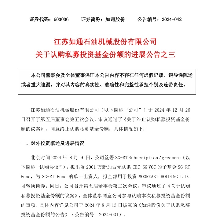 据如通股份披露,公司于12月26 日召开了第五届董事会第五次会议,审议通过了《关于终止认购私募投资基金份额的议案》,同意终止认购私募基金份额。