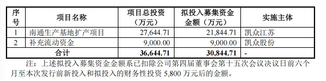 2024年5月27日,凯众股份发布公告,拟向不特定对象发行可转债募资不超过3.08亿元,扣除发行费用后将用于南通生产基地扩产项目、补充流动资金。