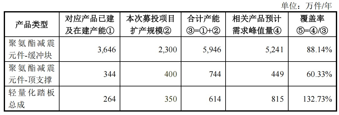 据测算,公司相关产品预计需求峰值量对公司现有、在建及本次募投产能的覆盖率分别为:缓冲块产品可覆盖88.14%;顶支撑产品可覆盖60.33%;轻量化踏板总成可覆盖132.73%。