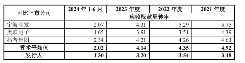 凯众股份还存在应收账款占比较高的问题。据募集说明书,2021年度、2022年度、2023年度和2024年1-6月,公司应收账款净额分别为1.66亿元、1.96亿元、2.66亿元和2.66亿元,占流动资产的比例分别为25.65%、30.26%、38.05%和40.17%;应收票据金额同样较高,分别为1926.63万元、5398.13万元、3229.27万元和2387.97万元,此外,公司应收账款周转率低于可比上市公司。