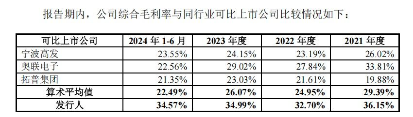此外,首轮问询还关注到凯众股份毛利率偏高的问题。报告期各期,公司毛利率分别为36.15%、32.70%、34.99%和34.57%,高于同行业可比公司平均水平。