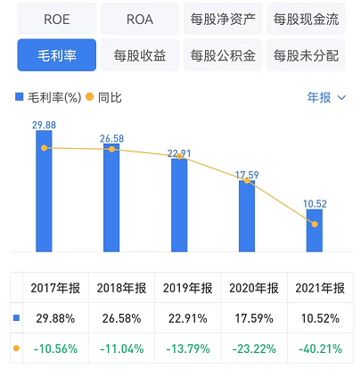 2017年-2021年,华立股份毛利率分别为29.88%、26.58%、22.91%、17.59%、10.52%。毛利率连续5年下滑。
