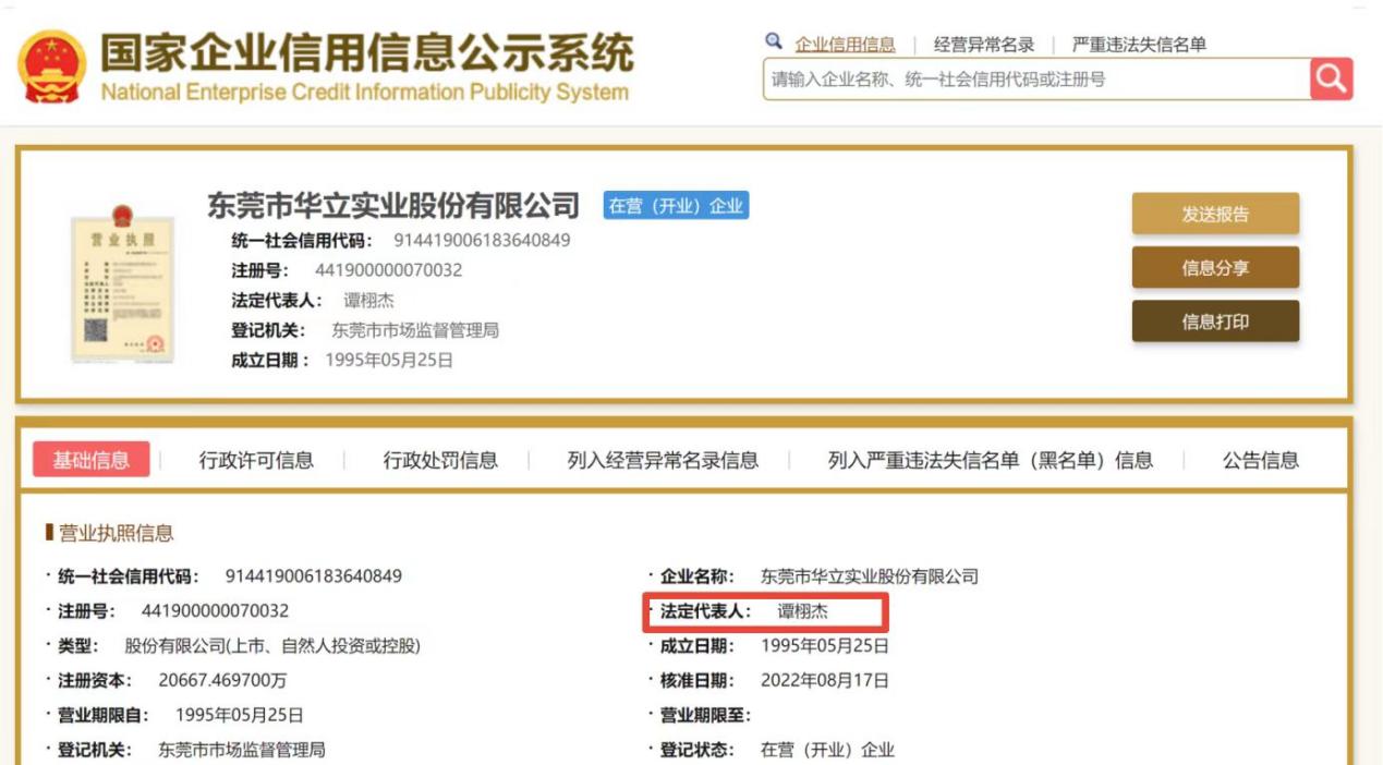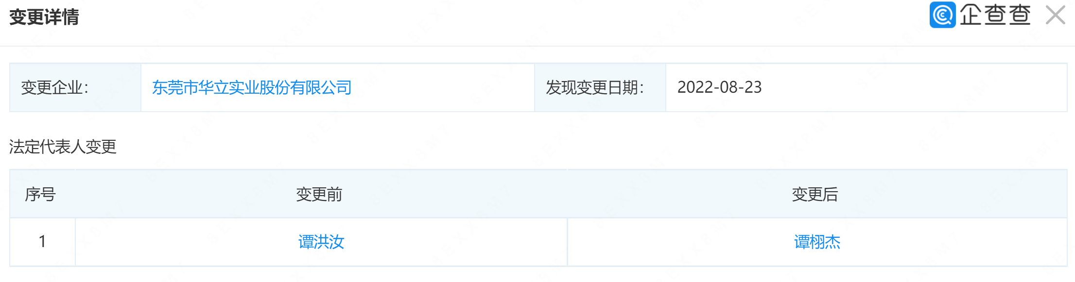 8月23日消息,信息显示东莞市华立实业股份有限公司(以下简称“华立股份”)法定代表人从谭洪汝变更为谭栩杰。