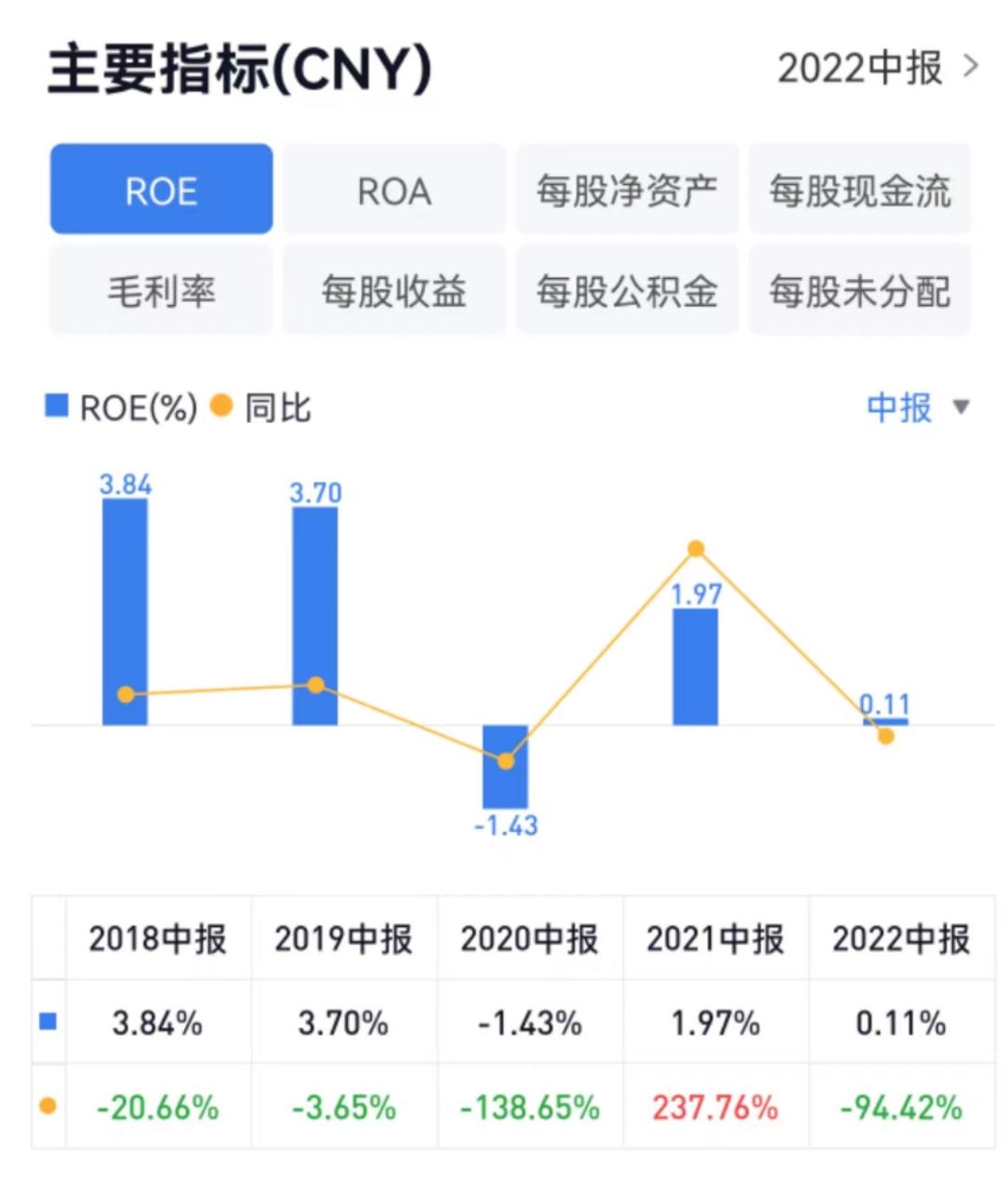 数据显示,2018年至2022年中报,华立股份ROE分别为3.84%、3.7%、-1.43%、1.97%、0.11%。2022年中报ROE同比减少94.42%。
