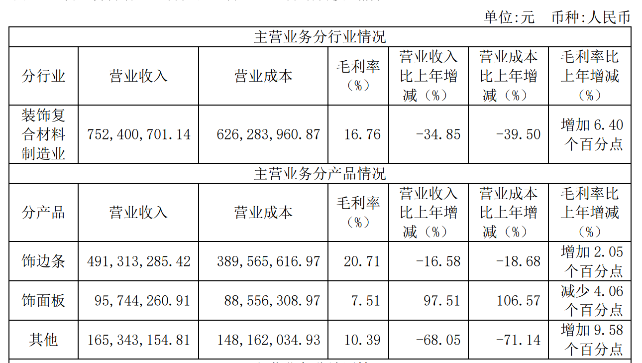 2022年,华立股份饰边条产品营业收入为4.91亿元,同比下降16.58%。饰面板产品营业收入为9574.43万元,同比上涨97.51%。其他产品营业收入为1.65亿元,同比下降68.05%。