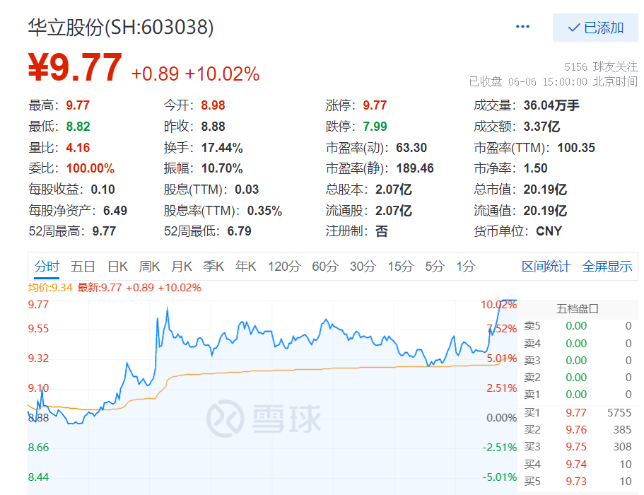 截至6月6日收盘,华立股份股价涨10.02%,报9.77元,总市值为20.19亿元。