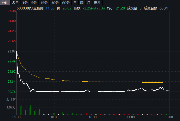 在抛出拟“跨界”收购的意向性协议后,主营装饰复合材料的华立股份(603038)却未能延续前一日股价涨停的强势走势,其今日低开后快速下挫,在跌停价反复“挣扎”。截至午间收盘该股股价报20.82元,下跌9.75%。