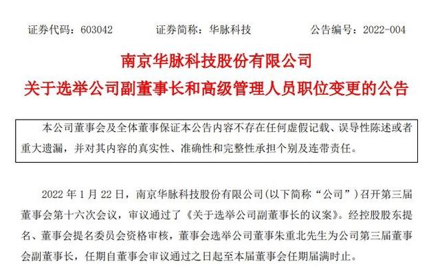 1月25日早间,南京华脉科技股份有限公司(以下简称“华脉科技”,证券代码:603042)发布《关于选举公司副董事长和高级管理人员职位变更的公告》。
