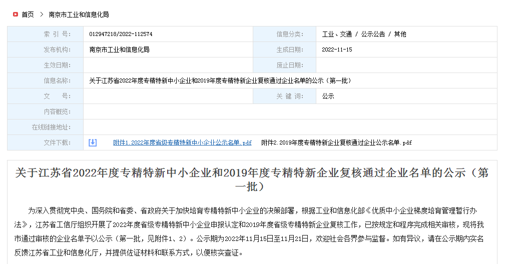 近日,南京市工业和信息化局发布了《关于江苏省2022年度专精特新中小企业和2019年度专精特新企业复核通过企业名单的公示(第一批)》,南京华脉科技股份有限公司从众多参选企业中脱颖而出,获得2022年度江苏省“专精特新”中小企业荣誉称号。